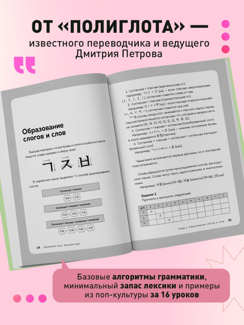 Самоучитель Дмитрия Петрова и Екатерины Лиджиевой — самый простой способ начать изучение корейского языка. Благодаря понятным примерам и универсальным схемам вы совершите незабываемое путешествия в мир хангыля и распахнете двери в «Страну Утренней свежести».