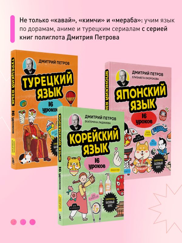 Это серия самоучителей от знаменитого полиглота и синхронного переводчика Дмитрия Петрова. Он уверен: чтобы заговорить на иностранном языке, совсем не обязательно посвящать его изучению десятилетия. Гораздо важнее освоить базовые алгоритмы, плюс — минимально необходимый для общения запас слов.