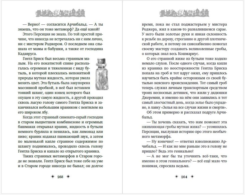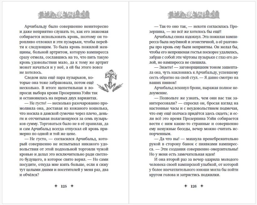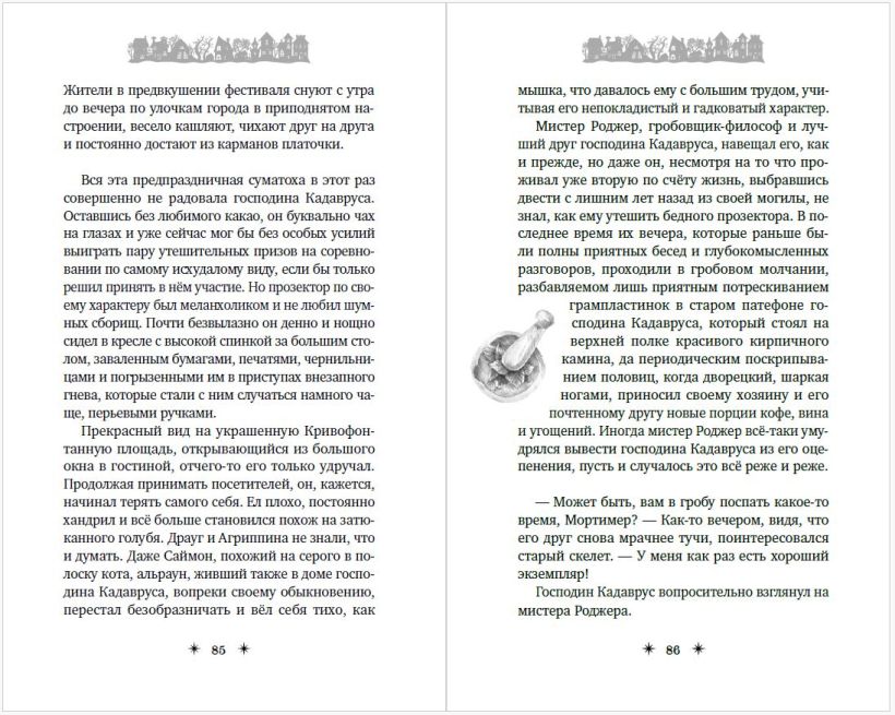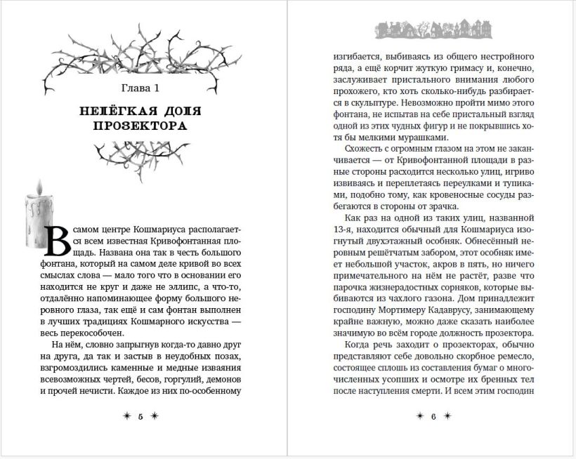 В книге много подробностей про мир, полный странных существ (вампиры, ведьмы, оборотни, призраки и другие), которые "на лицо ужасные, но добрые внутри". При этом персонажи не шаблонные, а каждый со своим характером. Автор рассказывает их истории, постепенно знакомя читателя с Кошмариусом.
