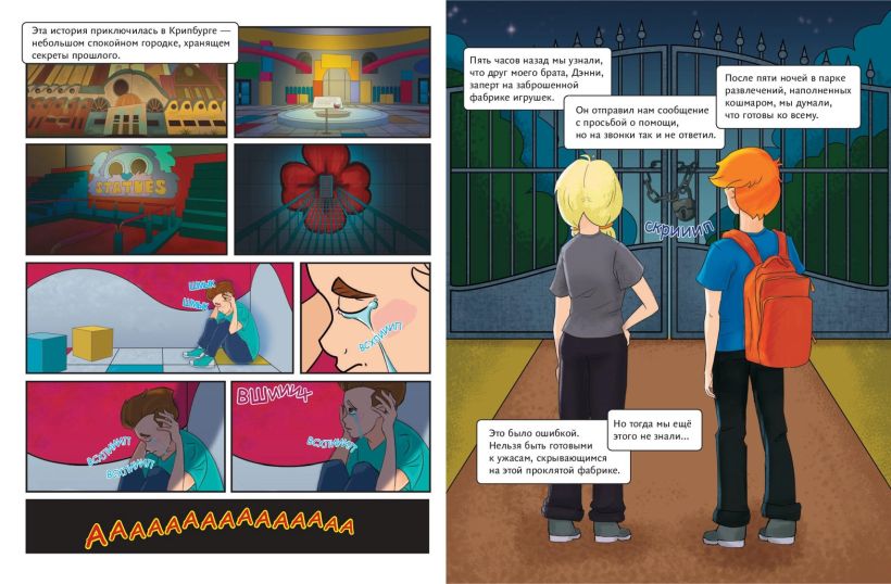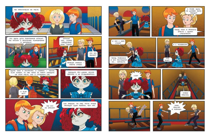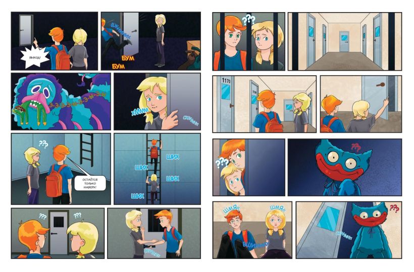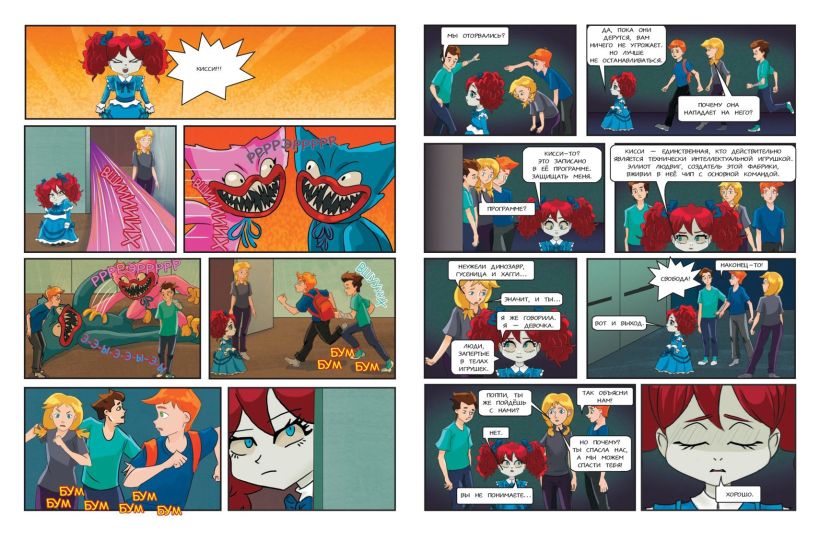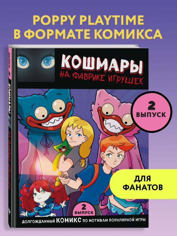 Популярная игра Poppy Playtime теперь в формате комикса! Перед тобой — продолжение хоррор-приключений Алекса и Ланы, которым на этот раз предстоит столкнуться с Хагги Вагги и другими обитателями зловещей фабрики игрушек.