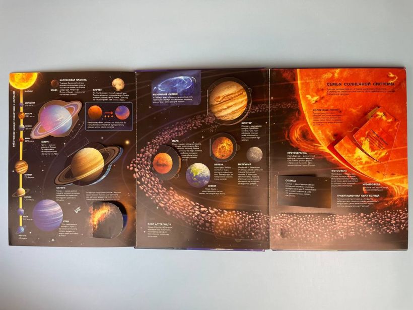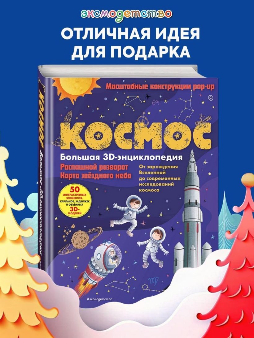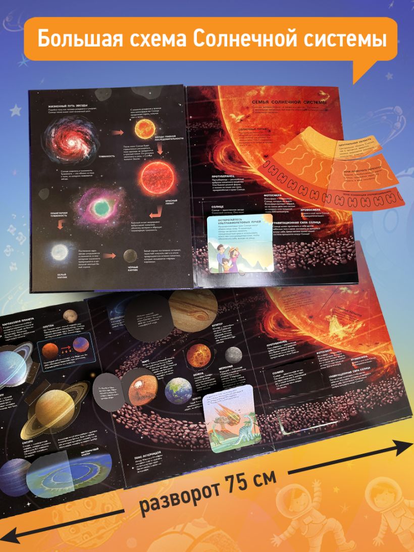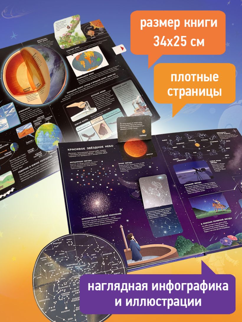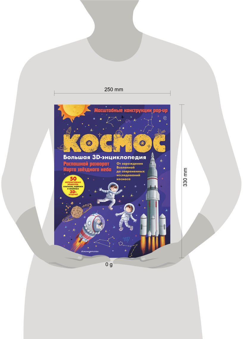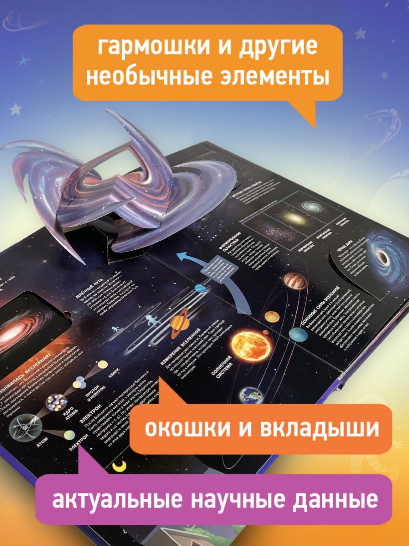 Большая энциклопедия о космосе с подвижными деталями и масштабными конструкциями pop-up! Интерактивные элементы разных форм и принципов действия: объёмные 3D-панорамы, множество клапанов, встроенные раскладные детали, карта звёздного неба, распашной разворот. Самая интересная информация о нашей Вселенной — от Большого взрыва до современных исследований космоса. Надёжно и качественно: большой формат, твёрдый переплёт, страницы из плотного картона.