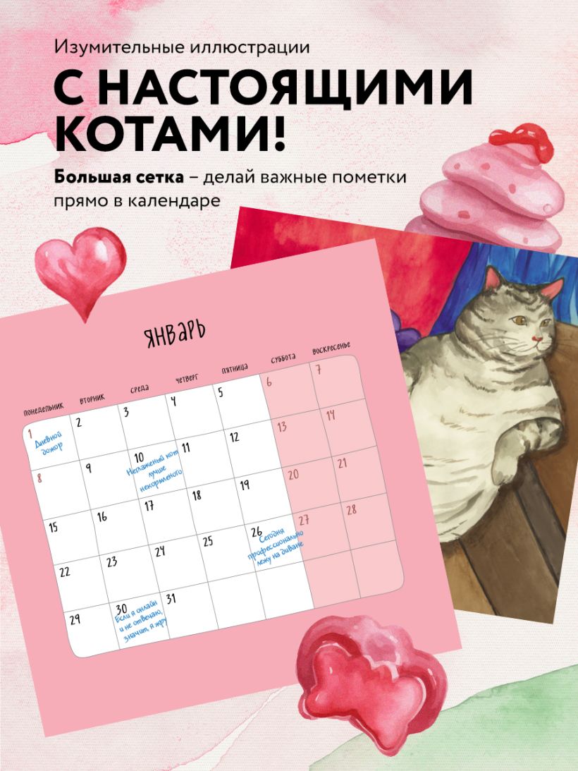 Авторские милые иллюстрации толстых котиков, которые будут поднимать вам настроение каждый день. На календарной сетке забавные фразы про котов и похудение.