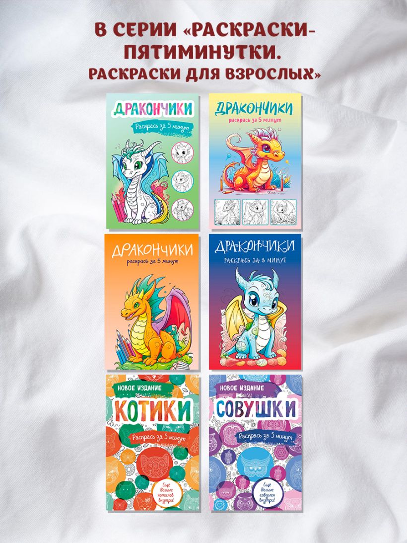 Уникальная особенность книг серии «Раскраски-пятиминутки» - это удобный карманный формат: такие раскраски вы можете всегда носить с собой, ни на минуту не расставаясь с любимым хобби.