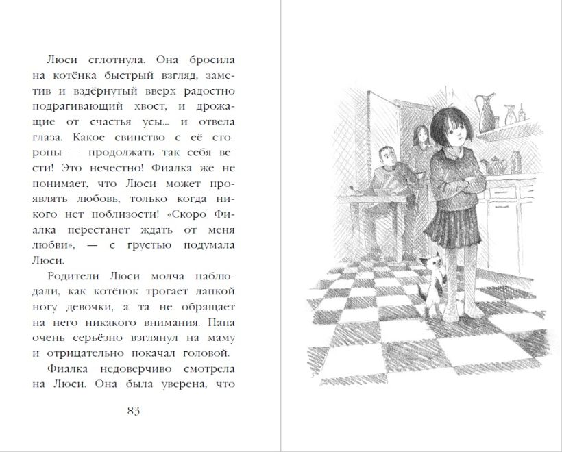 Только девочка не предусмотрела одного — родители, расстроившись оттого, что их подарок не пришелся дочери по сердцу, решат вернуть Фиалку прежней хозяйке. И как поступить Люси, которая уже привязалась к котёнку? Как признаться в своём обмане?