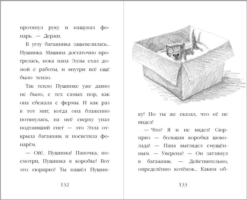 Это специальное новогоднее издание с красивой обложкой, на которой будто бы переливается снег. Внутри белая бумага и крупный шрифт, который удобно читать, и прекрасные чёрно-белые иллюстрации.