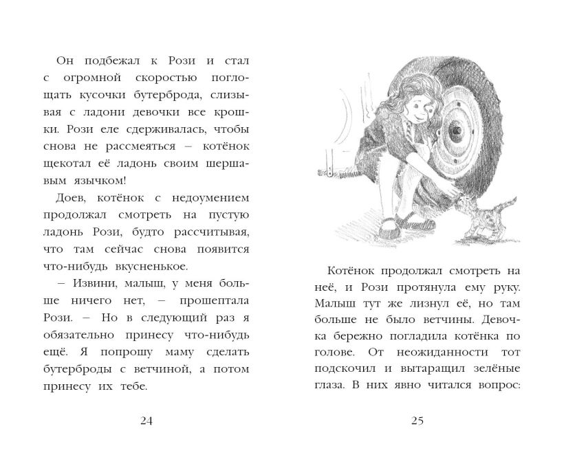 Однажды мечта Эми исполнилась — на пороге её домика на дереве появилась маленькая чёрно-белая кошечка. Девочка давно упрашивала родителей завести питомца, а кошечка оказалась ничьей, поэтому Эми решила, что теперь просто обязана её приютить. Девочке удалось уговорить родителей, только вот она увидела объявление о пропаже с фотографией той самой кошечки… Как же Эми поступить? Каждая книга этой серии — добрая история, в которой без назидания даются уроки об отзывчивости и умении дружить. Холли Вебб давно пишет детские книги и пользуется популярностью во всем мире, но особенно её полюбили в России. Серия «Добрые зверята» неизменно входит в списки бестселлеров. Множество родителей рассказывают, что их дети просто влюбились в эти истории и начали сами читать. Книга издана на белой бумаге, внутри достаточно крупный шрифт и потрясающей красоты чёрно-белые иллюстрации, которые позволят детям переключать внимание, не нагружая чрезмерно глаза. Книги подходят для детей от 6—7 лет. Отличный подарок на день рождения, для первоклассника или ребёнка постарше.