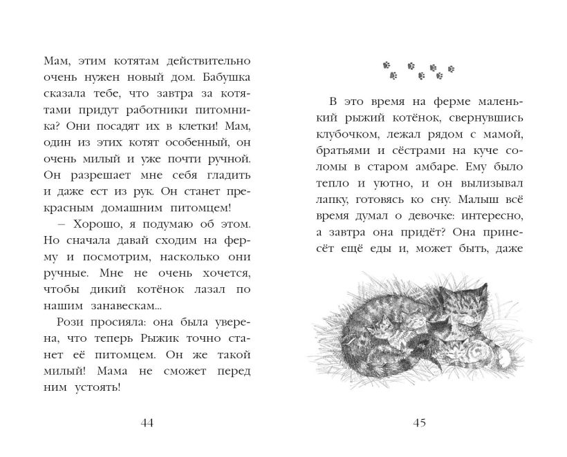 Как же Рози найти котёнка Рыжика? Он жил на ферме. Ферму продали, а всех живших там кошек отвезли в приют. Всех, кроме ярко-рыжего котёнка, к которому так привязалась Рози. Теперь девочка не знает, что ей делать. Мама и бабушка готовы ей помочь, но они тоже в растерянности. Откуда им начинать поиски? Но как бы ни сложилась история, Рози уверена в одном — никогда нельзя опускать руки!