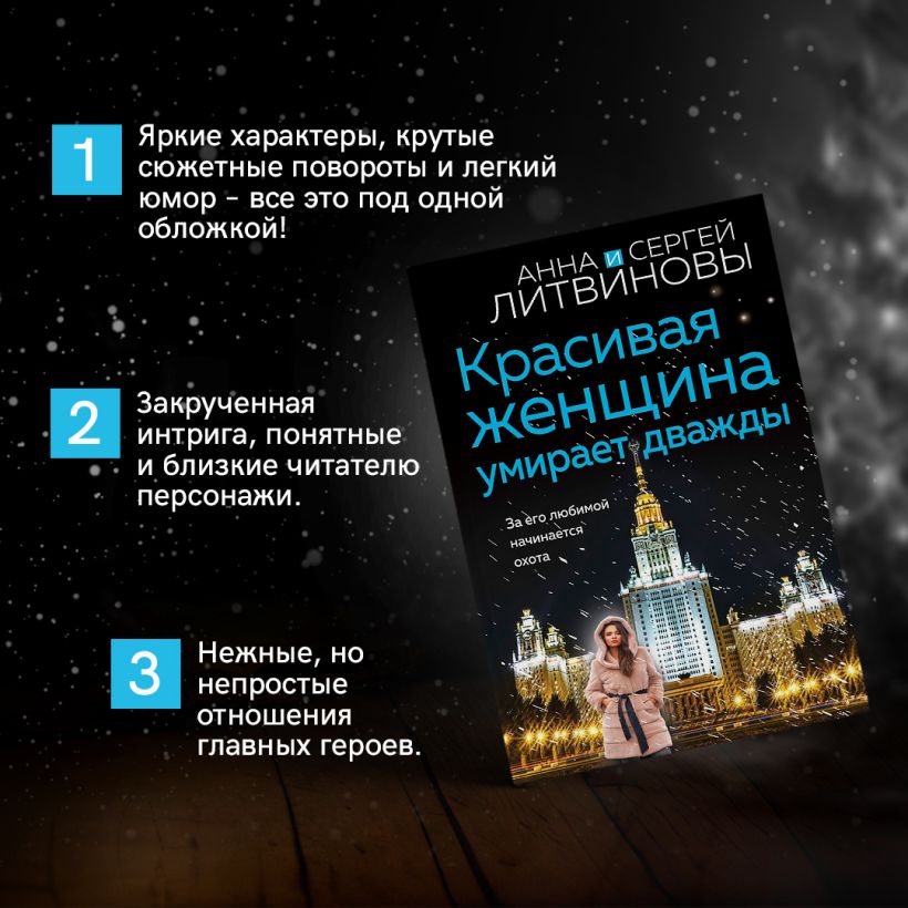 Новый роман Анны и Сергея Литвиновых, известных соавторов в мире российской остросюжетной литературы, носит интригующее название «Красивая женщина умирает дважды». Он безусловно займет достойное место среди их произведений. Закрученная интрига, понятные и близкие читателю персонажи, современные проблемы — вот секрет успеха хорошего детектива за авторством Литвиновых. Следствие вновь ведут хорошие известные читателям по романам и телесериалам герои — журналист Дима Полуянов и его верная подруга, библиотекарь Надя Митрофанова. И на этот раз их ждет нечто невероятное…