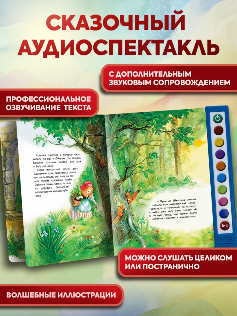Музыкальная книга-плеер — это прекрасное сочетание традиционной книги и современных технологий. Красочное иллюстрированное издание классической сказки дополнено звуковым модулем-плеером. Яркие, крупные кнопки на панели модуля позволяют прослушать сказку как по главам, так и полностью, от начала до конца, а также сделать паузу в прослушивании. Время звучания всей сказки — 25 минут, РЕКОРД СРЕДИ ЗВУКОВЫХ КНИГ. Наша книга — это идеальный вариант «сказки на ночь»: пока ребёнок слушает книгу и засыпает, взрослые могут заняться своими делами. Профессиональное художественное чтение текста сопровождается завершёнными музыкальными композициями — шедеврами мировой классики. Только в наших книгах-плеерах используются дополнительные звуки (шелест листвы, пение птиц и т. п.), создающие эффект присутствия на настоящем спектакле!