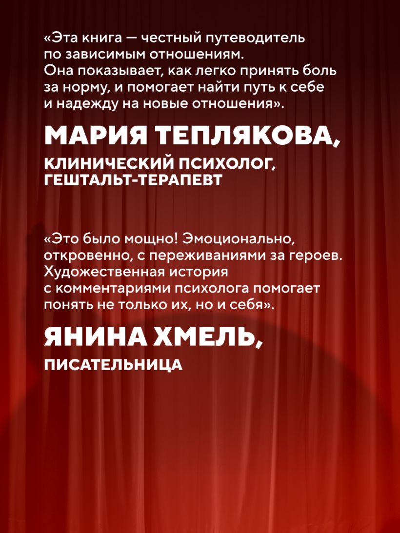 «Эта книга — путеводитель по зависимым отношениям, который показывает, как изнурительны терзания героини и насколько глубоко можно погрязнуть в нездоровых отношениях, воспринимающихся за норму. Очень человечная книга, дающая надежду и помогающая найти дорогу к себе, что особенно важно для жертв абьюза». — Мария Теплякова, клинический психолог, гештальт-терапевт