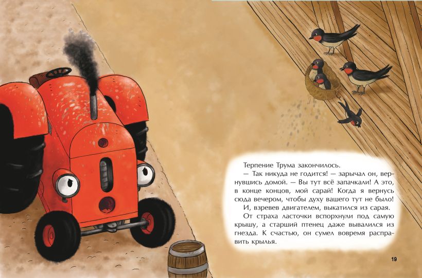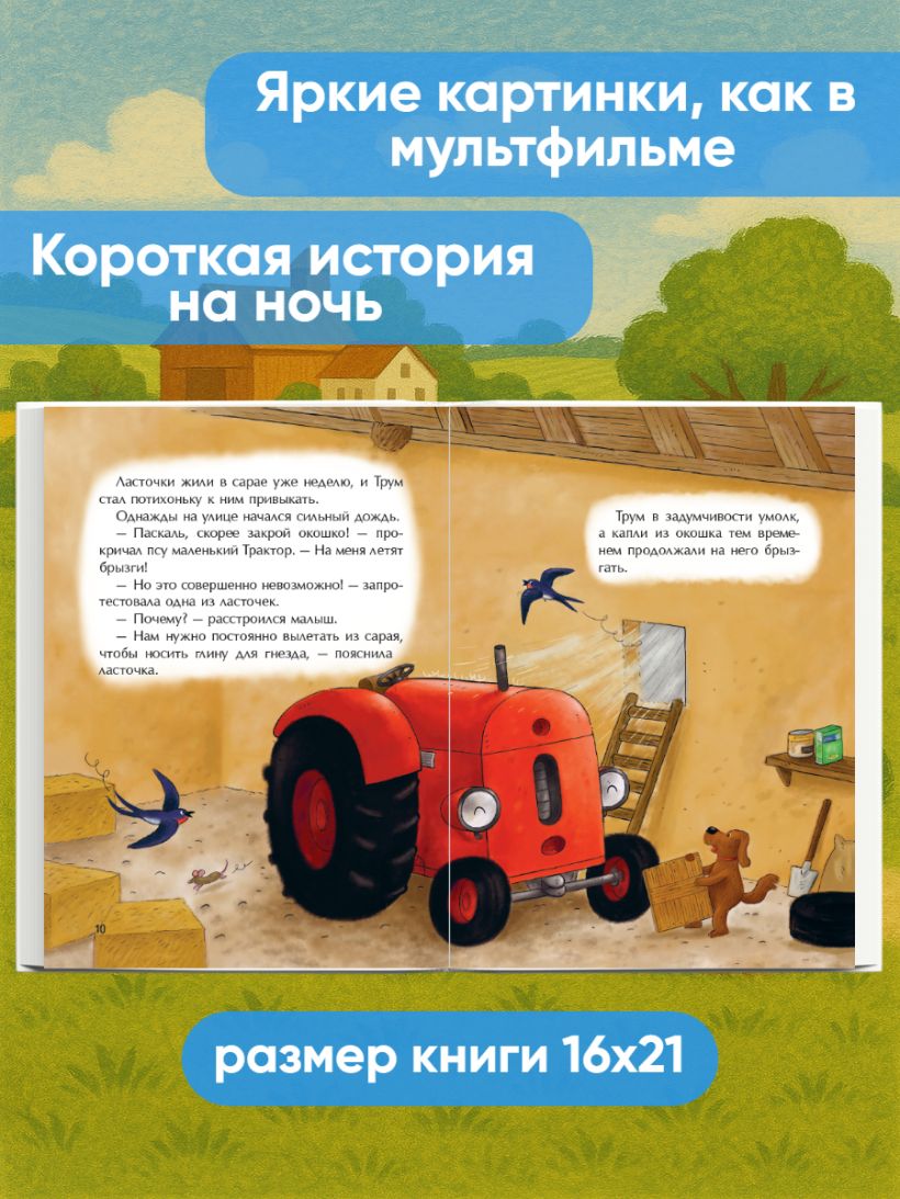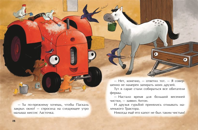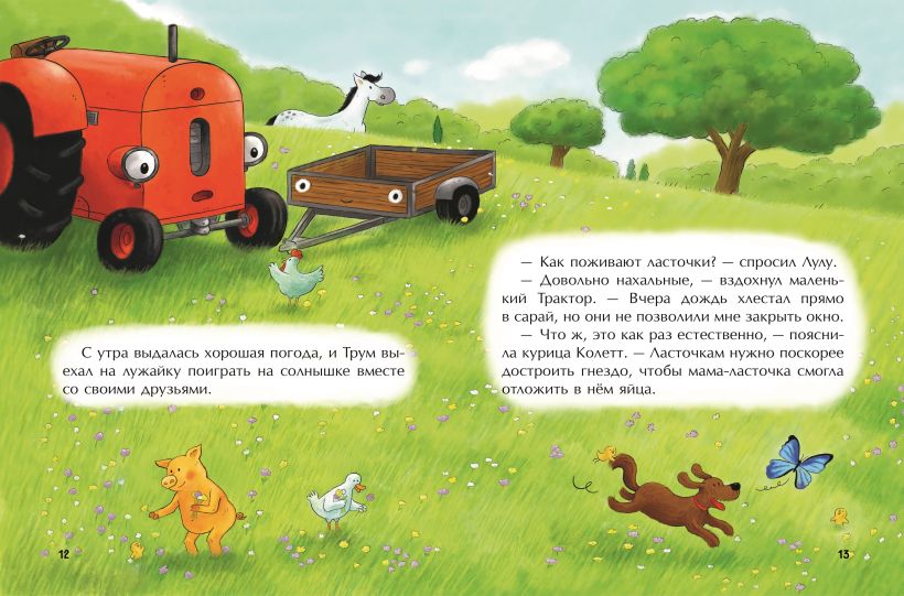 Очень удачная идея, познакомить нас с героями книги сразу на форзаце. Эти герои - маленький красный трактор по имени Трум и жители фермы - собака, поросенок, утка, курица и конь.