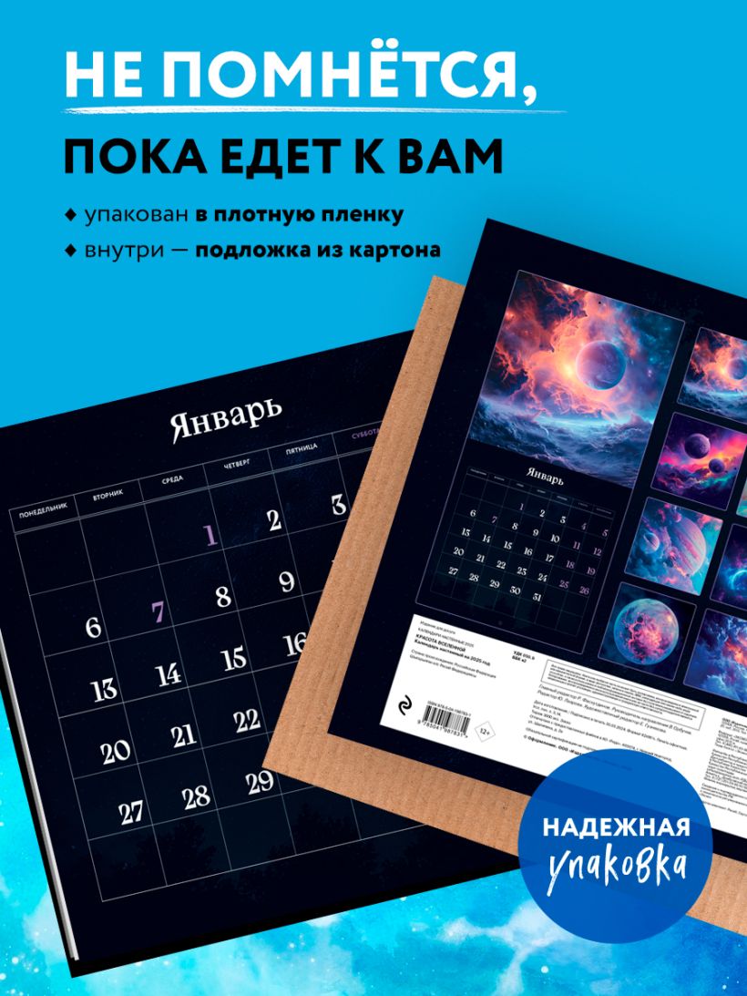 Яркий календарь с невероятными космическими изображениями — лучший подарок для близких, друзей, родных и любимых. Завораживающие иллюстрации с изображениями Вселенной на каждый месяц года украсят ваш дом, офис, дачу, зону отдыха и рабочее пространство. Вперед в Космос!