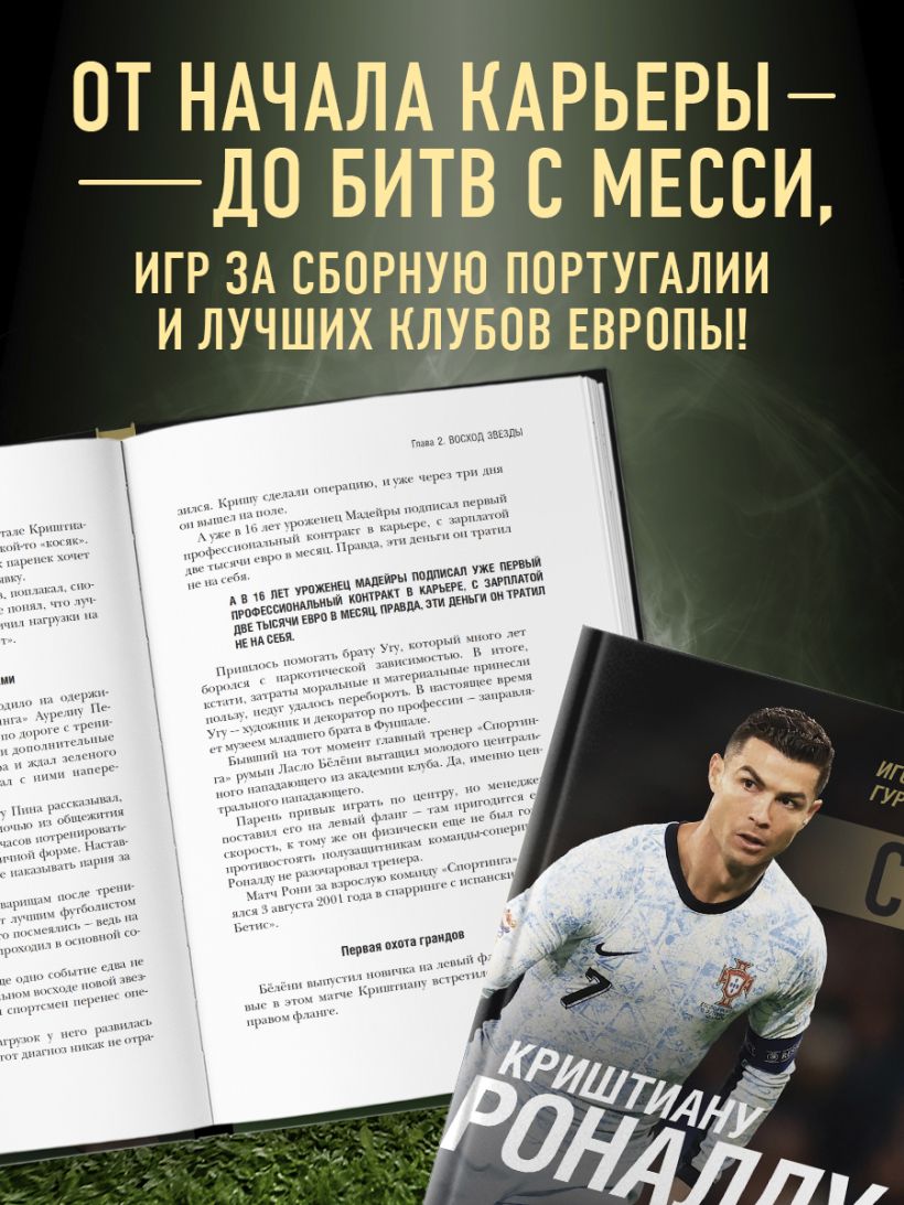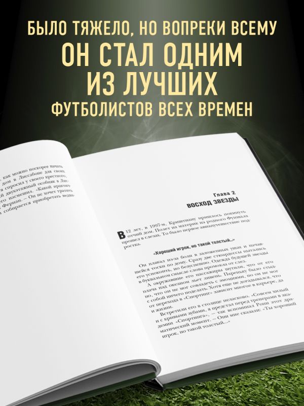ПОГРУЗИТЕСЬ В ЗАХВАТЫВАЮЩИЙ МИР ФУТБОЛЬНОЙ ЛЕГЕНДЫ, ЧЬЕ ИМЯ СТАЛО СИНОНИМОМ УСПЕХА И ВДОХНОВЕНИЯ. ЭТА БИОГРАФИЯ КРИШТИАНУ РОНАЛДУ — НЕ ПРОСТО КНИГА, А НАСТОЯЩАЯ ОДИССЕЯ, РАССКАЗЫВАЮЩАЯ О ПУТИ МАЛЬЧИКА С МАДЕЙРЫ ДО ВЕЛИЧАЙШЕГО ИГРОКА ВСЕХ ВРЕМЕН.