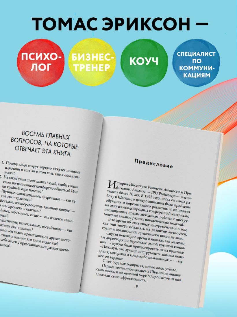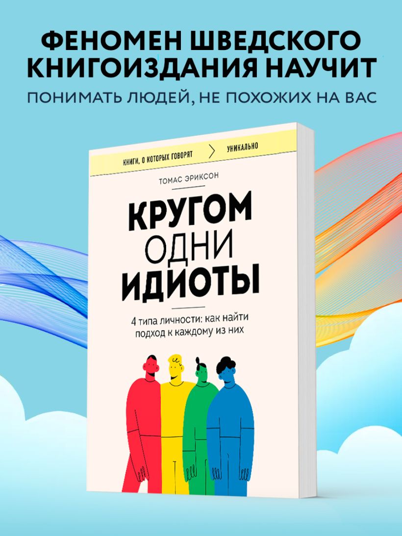В основе книги лежит несложная методика цветотипирования человеческих характеров. Шведский психолог Томас Эриксон делит всех людей на четыре типа: красный, желтый, зеленый, синий — и очень увлекательно, на узнаваемых примерах описывает логику поведения, темперамент, систему ценностей представителей каждого типа. Казалось бы, ничего нового. Подобный подход использовался психологами на протяжении десятилетий. Но Томасу Эриксону удалось придумать настолько удобную систему работы с известными инструментами, что сегодня книга «Кругом одни идиоты» лежит на столе каждого шведского руководителя, учителя и журналиста.