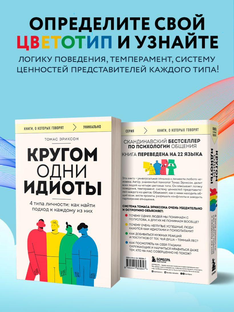 ФЕНОМЕН ШВЕДСКОГО КНИГОИЗДАНИЯ «Кругом одни идиоты» побила все рекорды шведского книжного рынка! Она стала одной из немногих скандинавских книг по популярной психологии, которая была переведена на 22 языка и продана общим тиражом 1 500 000 экземпляров! В течение двух лет книга держится в Топ-5 нехудожественных произведений среди всех скандинавских изданий и не собирается сдавать позиций. В ЧЕМ СЕКРЕТ УСПЕХА В основе книги лежит несложная методика цветотипирования человеческих характеров. Шведский психолог Томас Эриксон делит всех людей на четыре типа: красный, желтый, зеленый, синий — и очень увлекательно, на узнаваемых примерах описывает логику поведения, темперамент, систему ценностей представителей каждого типа. Казалось бы, ничего нового. Подобный подход использовался психологами на протяжении десятилетий. Но Томасу Эриксону удалось придумать настолько удобную систему работы с известными инструментами, что сегодня книга «Кругом одни идиоты» лежит на столе каждого шведского руководителя, учителя и журналиста. ЧЕМУ УЧИТ ЭТА КНИГА Прежде всего тому, как понимать тех, кого понять решительно невозможно, — людей с максимально отличным от нашего образом мышления, темпераментом и системой ценностей. Эту книгу можно назвать универсальной отмычкой к личности любого человека. Томас Эриксон помогает не только понять, что происходит в чужой голове и душе, но и позволяет понять, как вас воспринимают окружающие. ОБ АВТОРЕ Томас Эриксон — шведский психолог, бизнес-тренер, коуч, специалист по коммуникациям. Автор двух международных бестселлеров — «Кругом одни идиоты» и «Кругом одни психопаты».