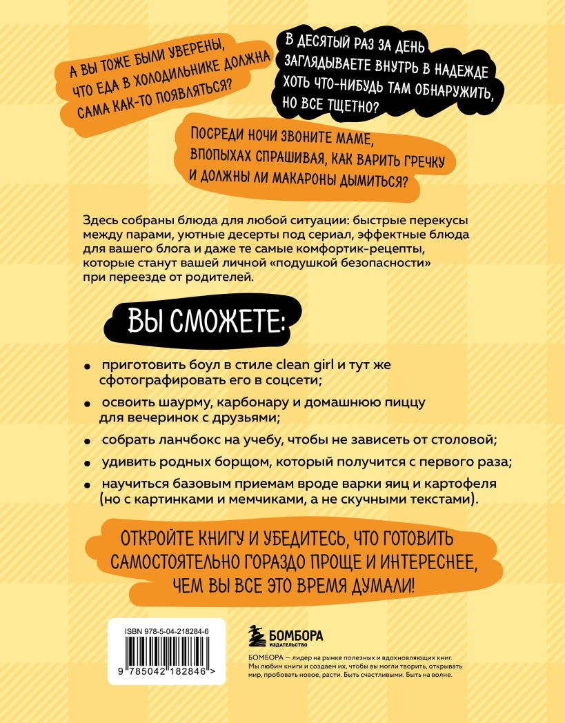 Эта книга — первый шаг к вкусной самостоятельной жизни без родителей! Внутри вы найдете рецепты, которые легко приготовить даже в общежитии или на маленькой кухне съёмной квартиры. От простых завтраков и быстрых перекусов до уютных десертов и настоящих хитов вроде рамена, пиццы или карбонары. Каждый рецепт оформлен пошаговыми схемами и яркими иллюстрациями — готовка становится понятной, а процесс похож на увлекательный комикс. Здесь нет сложных терминов и занудных инструкций, только доступные продукты, понятные действия и идеи, которые легко повторить.