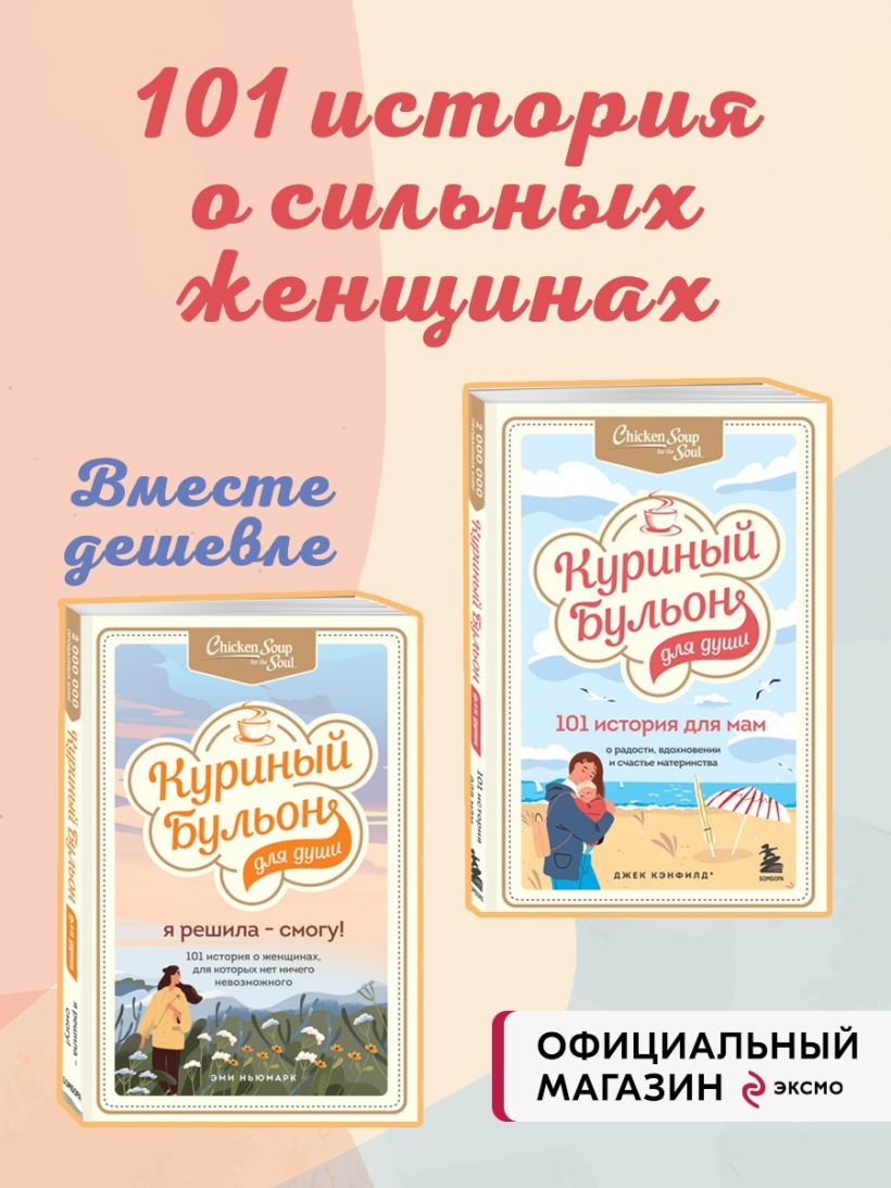 В состав комплекта вошли две книги серии «Куриный бульон для души»: «Куриный бульон для души. Я решила — смогу! 101 история о женщинах, для которых нет ничего невозможного» и «Куриный бульон для души. 101 история для мам. О радости, вдохновении и счастье материнства».