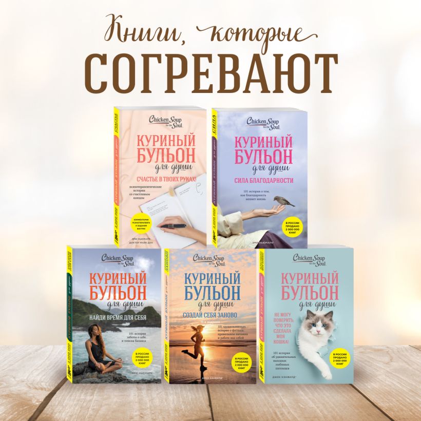 НОВИНКА В СЕРИИ «КУРИНЫЙ БУЛЬОН ДЛЯ ДУШИ». ПРОДАНО БОЛЬШЕ 2 000 000 книг. В детстве, когда вы болели, ваша бабушка давала вам куриный бульон. Сегодня питание и забота нужны вашей душе. Маленькие истории из «Куриного бульона» исцелят душевные раны и укрепят дух, дадут вашим мечтам новые крылья и откроют секрет самого большого счастья — счастья делиться и любить. Счастье — это не удачное совпадение и не подарок судьбы. Это состояние, которое можно создать своими руками — шаг за шагом, правильными мыслями и хорошими поступками. В новом сборнике «Куриного бульона» собраны сотни жизненных историй людей, которые нашли личный рецепт счастья. Даже один маленький шаг способен изменить жизнь к лучшему! Каждый день на работе в супермаркете Триша испытывала раздражение и стресс, но улыбки и радушие нового менеджера вдохновили ее взглянуть на рабочие будни иначе. Семейные застолья оборачивались для Мелоди изнурительным мытьем посуды, пока она не решила увидеть в этом занятии приятное — благодарность за время, проведенное с родными. Элисон пережила тяжелый период и думала, что не сможет оправиться. Вечеринка-сюрприз от близких людей помогла ей отбросить грусть и снова поверить в хорошее. И еще 98 историй, которые помогут улыбнуться новому дню.