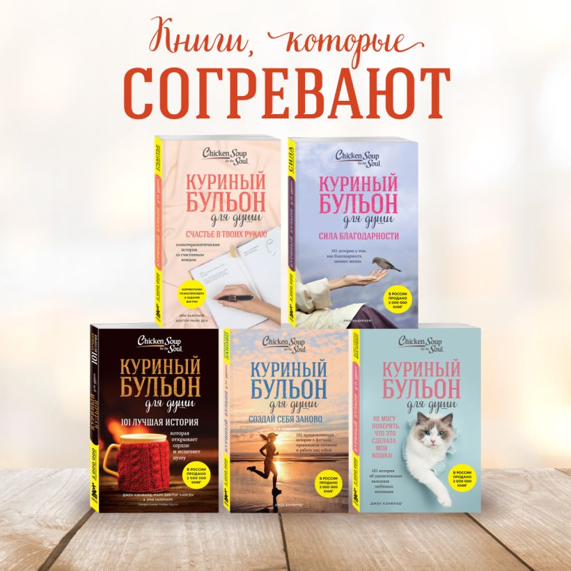 Счастье не приходит случайно и не зависит от обстоятельств — его можно "приготовить" самому. Шаг за шагом, из благодарности, добрых мыслей и маленьких радостей рождается чувство внутреннего тепла и гармонии. В новом сборнике "Куриного бульона" собраны 101 реальная история о людях, которые нашли свой ключ к счастью: научились прощать, помогать, принимать себя и радоваться простым вещам. Этот сборник вдохновит вас взглянуть на жизнь по-новому добавить красок в будни и почувствовать, что свет внутри нас горит всегда — стоит лишь заметить его.
