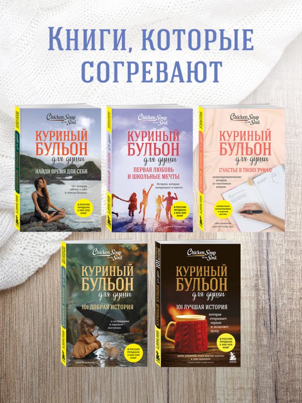 В детстве, когда вы болели, ваша бабушка давала вам куриный бульон. Сегодня питание и забота нужны вашей душе. Маленькие истории из «Куриного бульона» исцелят душевные раны и укрепят дух, дадут вашим мечтам новые крылья и откроют секрет самого большого счастья — счастья делиться и любить.