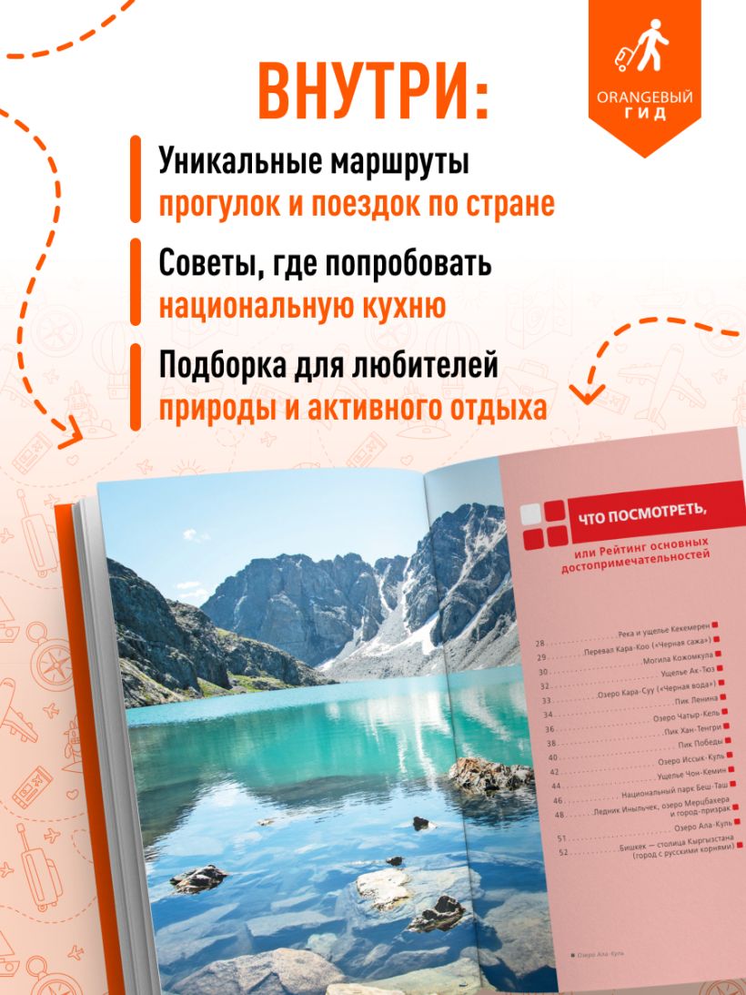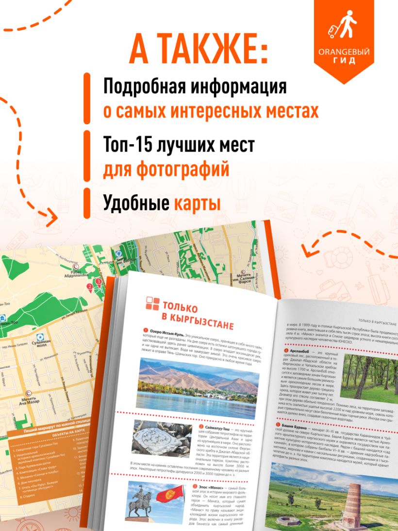 В нем содержится актуальная и полезная информация о главных городах страны, различные маршруты на любой вкус, подсказки, что делать, если идет дождь, или где искать лучшие смотровые площадки, а также множество полезных авторских советов. Посетите жемчужину Центральной Азии озеро Иссык-Куль, отправьтесь в ущелье Кекемерен или прогуляйтесь в курортном городе Чолпон-Ате — выбор только за вами!