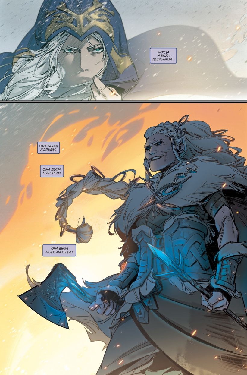 Встречайте новый комикс по одной из самых знаменитых игр мира, созданный сценаристом Riot Одином Остином Шафером и отечественной художницей Ниной Вакуевой ("Майор Гром"). Вы станете свидетелями ранних дней жизни знаменитой Хладорождённой и увидите, какую роль в её становлении сыграла мать, как Эш обрела своё племя и с чего началась вражда с Седжуани. В обширных дополнительных материалах вы найдёте комментарии художницы, процесс работы над рисунком, а также рассказ "Молчание для проклятых", который и сделал возможным появление комиксов по вселенной League of Legends.