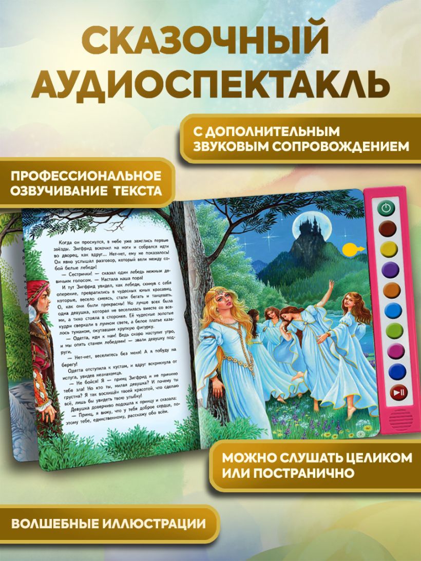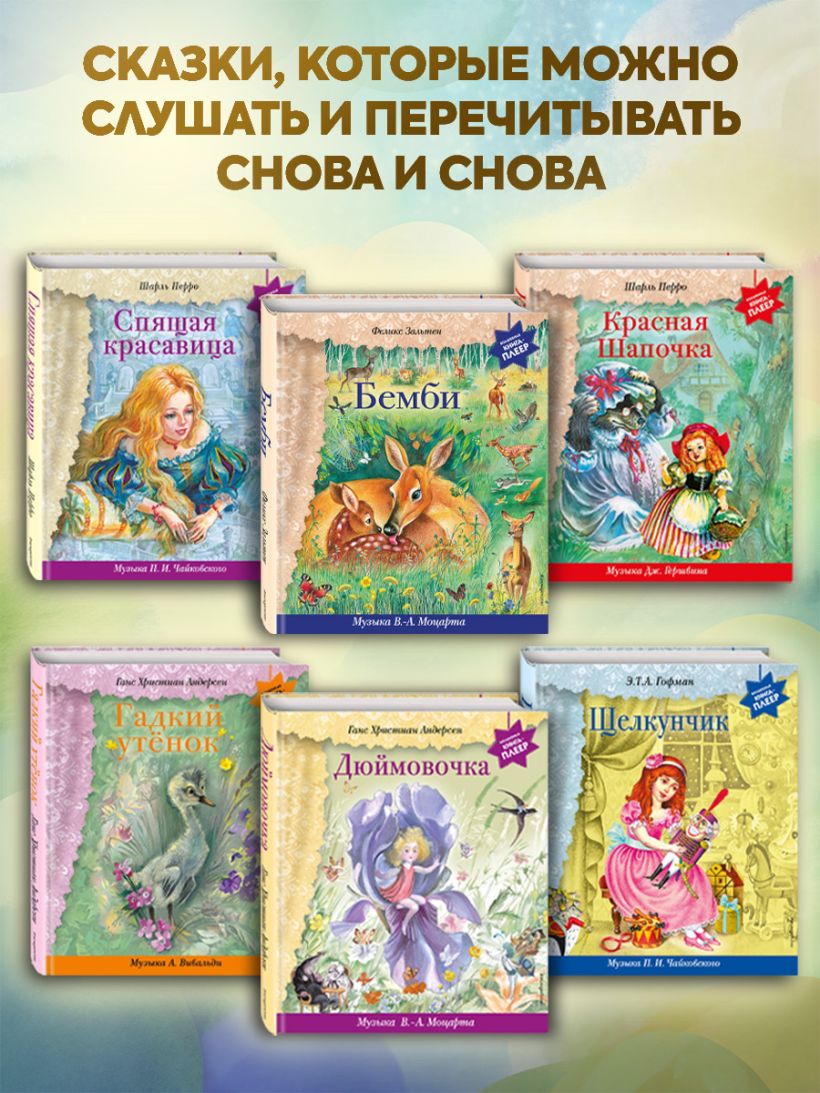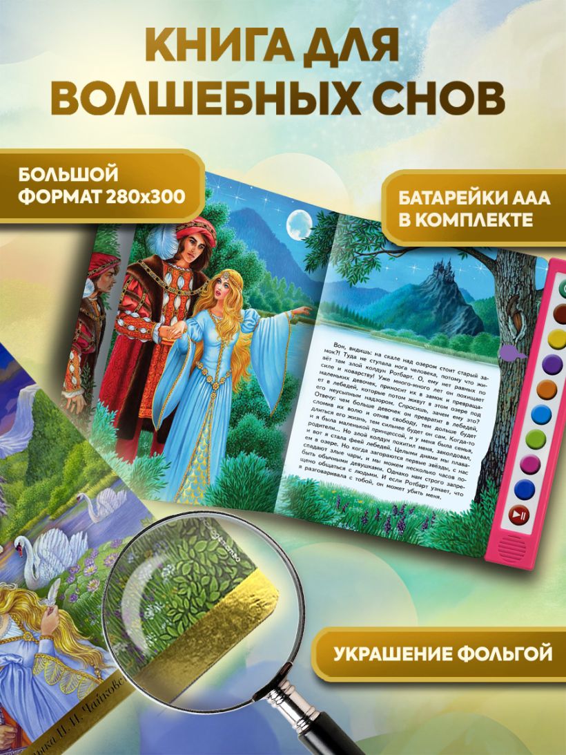 Музыкальная книга-плеер — это прекрасное сочетание традиционной книги и современных технологий. Красочное иллюстрированное издание классической сказки дополнено звуковым модулем-плеером. Яркие, крупные кнопки на панели модуля позволяют прослушать сказку как по главам, так и полностью, от начала до конца, а также сделать паузу в прослушивании. Время звучания всей сказки — 25 минут, РЕКОРД СРЕДИ ЗВУКОВЫХ КНИГ. Наша книга — это идеальный вариант «сказки на ночь»: пока ребёнок слушает книгу и засыпает, взрослые могут заняться своими делами. Профессиональное художественное чтение текста сопровождается завершёнными музыкальными композициями — шедеврами мировой классики. Только в наших книгах-плеерах используются дополнительные звуки (шелест листвы, пение птиц и т. п.), создающие эффект присутствия на настоящем спектакле!