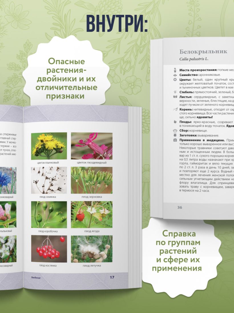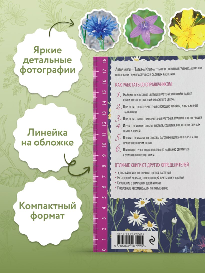 Удобная группировка по цвету венчика цветка, цветные фотографии и линейка на обложке помогут с легкостью идентифицировать находку. Кроме того, книга имеет небольшой формат, благодаря чему ее всегда удобно взять с собой.