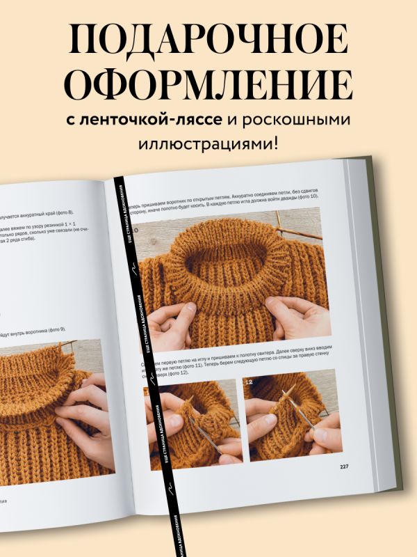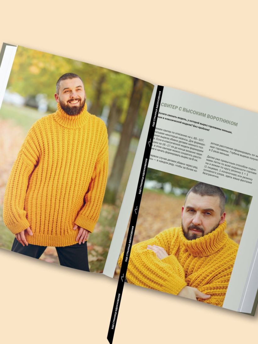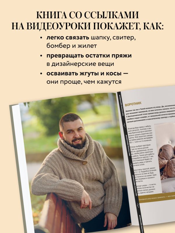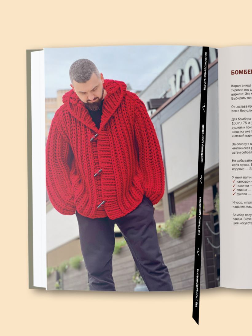 • 13 стильных моделей спицами: шапки, шарфы, жилет, бомбер, свитера, легендарные «Кардиганище» и «Легендарный Свитер» с вариациями и модификациями;