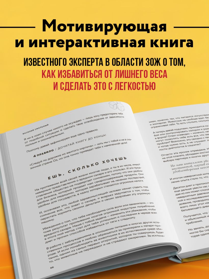 Почему мы выбираем тот или иной вредный продукт и что пытаемся "заесть" с его помощью? Какие мифы, созданные вокруг сладкого, поддерживают тягу к сахару? Почему важно быть в контакте со своим телом и что такое настоящий голод? Василий Смольный, эксперт в области снижения веса, известный блогер и популяризатор здорового образа жизни, автор бестселлеров "ППдляТП", "ППдляТП2", помогает разобраться в этих и многих других вопросах касательно употребления сахара. Его авторская “Система EASY” позволяет без иллюзий взглянуть на вредную еду, к которой мы так привыкли, чтобы выбраться из сахарной зависимости и благодаря этому снизить вес, улучшить самочувствие, поднять самооценку, стать энергичнее и поправить здоровье. Она основана на психологических методиках из когнитивно-поведенческой терапии и помогает разобраться с установками и заблуждениями, которые искажают и дестабилизируют пищевое поведение. С ее помощью вы сможете с легкостью сократить сладкое и мучное в рационе, потому что перестанете испытывать потребность в такой еде и сформируете новый, более здоровый взгляд на свое питание.
