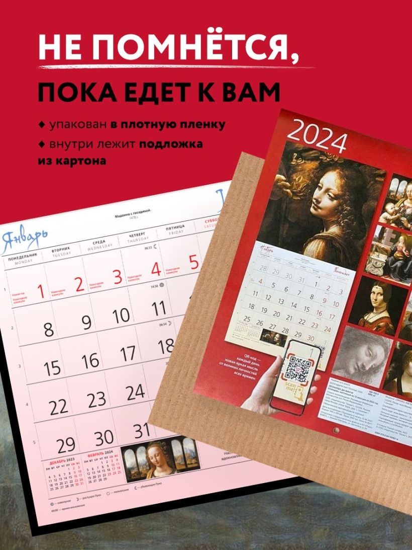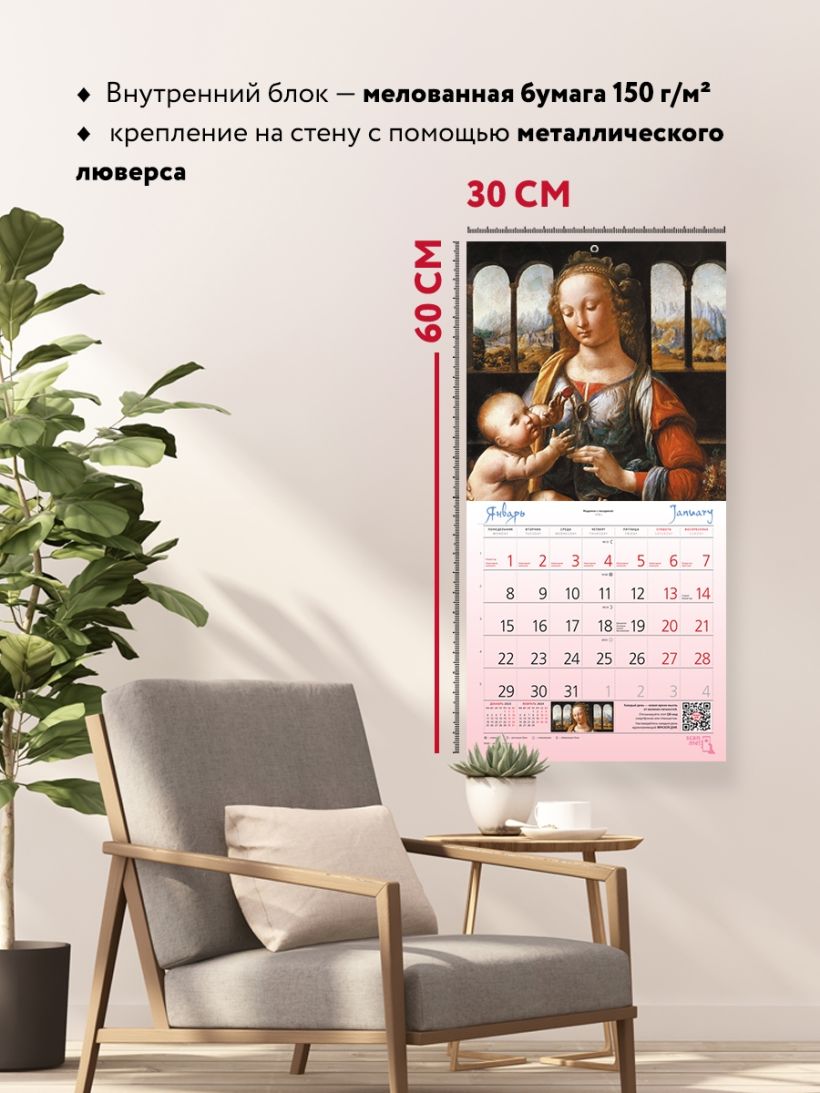 Практичный и эстетичный, этот календарь каждый месяц будет радовать вас. Прекрасные картины органично дополнят любой интерьер и помогут планировать время. В этом календаре представлены шедевры кисти Леонардо да Винчи.