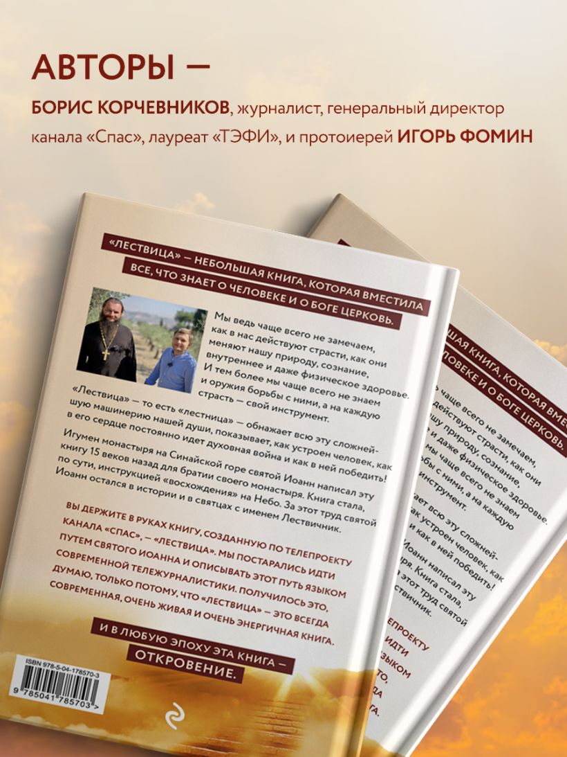 «Лествица святого Иоанна Лествичника. Тридцать ступеней на пути к Богу» - книга, созданная по телепроекту канала «Спас». Борис Корчевников и протоиерей Игорь Фомин постарались идти путем святого Иоанна и описывать этот путь языком современной тележурналистики. «Лествица» - это всегда современная, очень живая и очень энергичная книга. И в любую эпоху это книга-откровение.