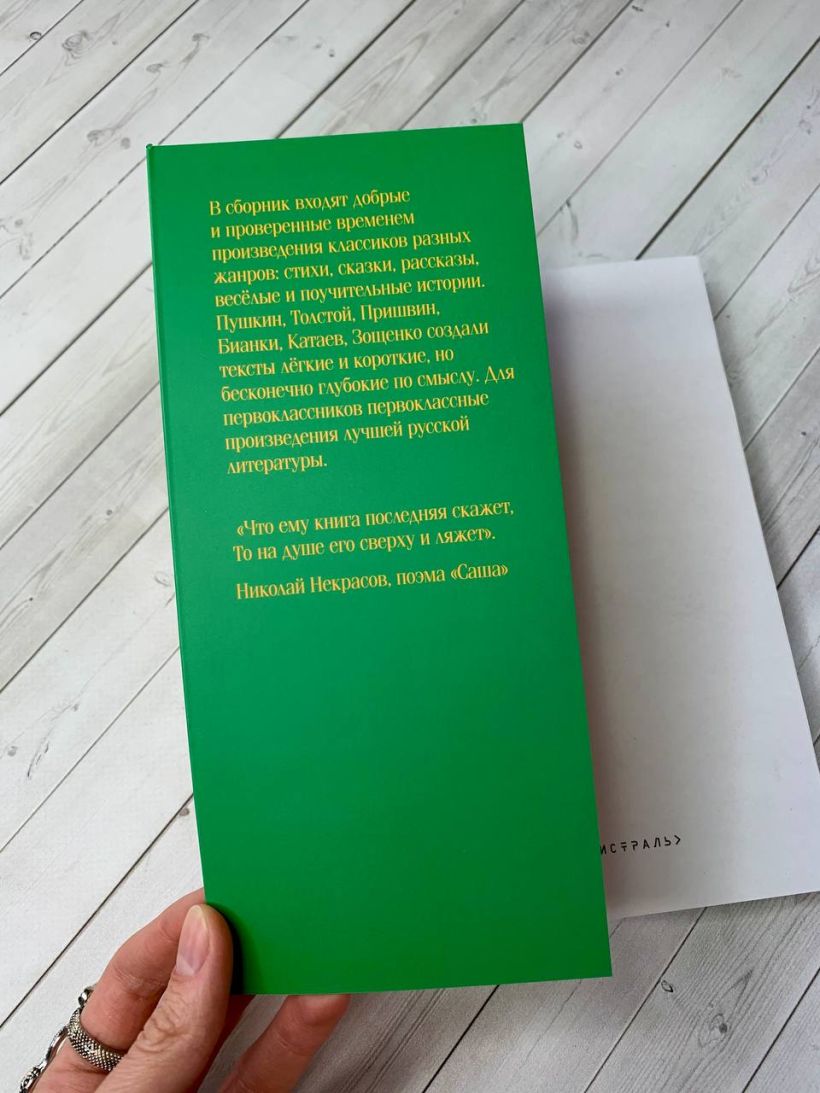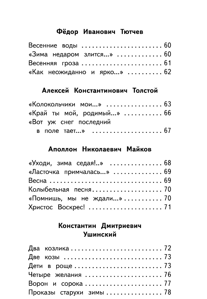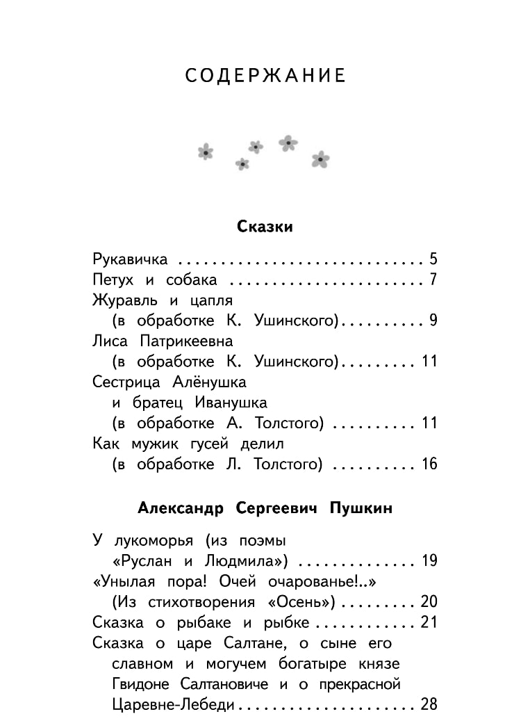 В книгу включены русские народные сказки, стихотворения и сказки А.С.Пушкина, рассказы Л.Н.Толстого, К.Д.Ушинского, М.М.Пришвина, В.В.Бианки, М.М.Зощенко и др.