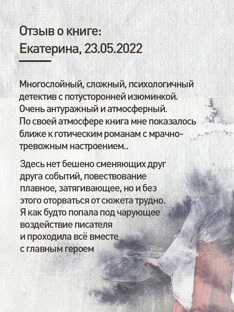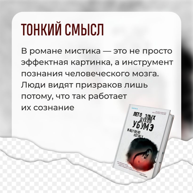 Это детектив подсознания, где каждому, чтобы увидеть, наконец, очевидное, надо неоднократно зайти в ту самую «формалиновую» комнату, куда «из библиотеки» вытеснены на хранение все травмирующие моменты. Но не просто зайти, а каждый раз быть «новым», «обновленным» человеком, уже нечто из своего подсознания осознавшим и вычистившим. Пройдя с автором и героями этот сложный путь, можно по достоинству оценить мотив преступления, расположенный в мистическом и одновременно крайне реальном мире ёкаев и убумэ, которых на самом деле, конечно же, нет, но они все же существуют.