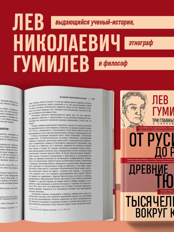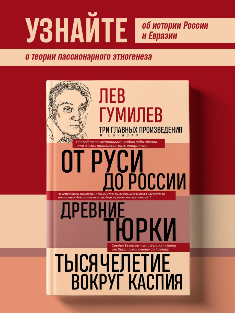 В книге «Лев Гумилев. От Руси к России. Древние тюрки. Тысячелетие вокруг Каспия» собраны три главных произведения автора, раскрывающие его уникальную теорию пассионарности и оригинальный взгляд на историческое развитие России. Под одной обложкой собраны знаменитые тексты об эволюции народов, населяющих территорию современной России, об истории тюрков, оказавших значительное влияние на развитие России, и этнологическое исследование Евразии, охватывающее полторы тысячи лет.