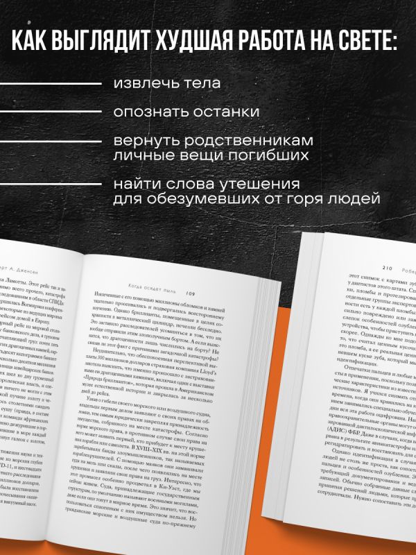 Роберта Дженсена называют лучшим в худшей работе на свете — он наводит порядок на месте авиакатастроф, терактов и стихийных бедствий с человеческими жертвами: извлекает тела, опознает останки, возвращает родственникам личные вещи погибших, находит слова утешения для обезумевших от горя людей. Для Дженсена самые мрачные заголовки газет — не просто слова. Он помогал опознавать жертв после теракта 1995 года в Оклахома-Сити, развернул мобильный морг в Пентагоне и работал на руинах башен-близнецов после терактов 11 сентября, эвакуировал тела пассажиров вертолета из джунглей Перу в 2008 году. Эта книга — не только беспощадный и пристальный взгляд Дженсена на тяжелейшую работу, о которой не принято говорить, но и вдохновляющая история о выживании, настойчивости и сострадании.