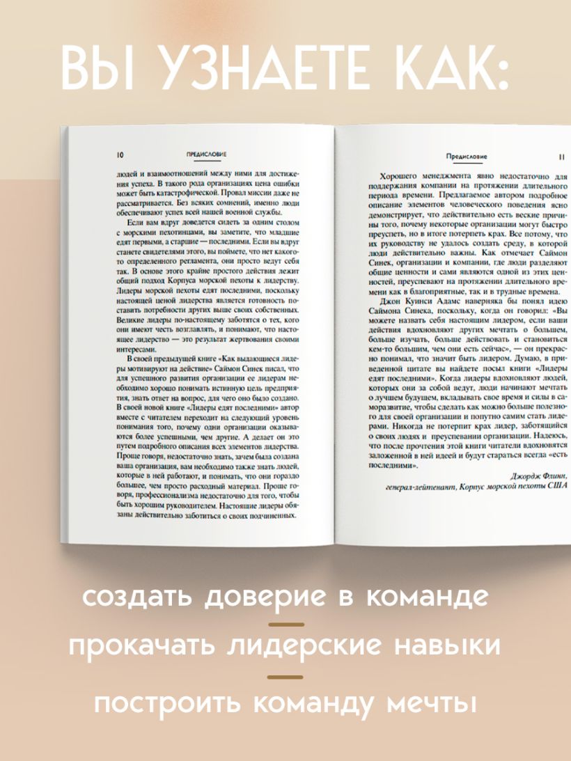 «Когда лидеры вдохновляют людей, которых они за собой ведут, люди начинают мечтать о лучшем будущем, вкладывать свое время и силы в саморазвитие, чтобы сделать как можно больше полезного для своей организации и попутно самим стать лидерами. Надеюсь, что после прочтения этой книги читатели вдохновятся заложенной в ней идеей и будут стараться всегда "есть последними"». — Джордж Флинн, генерал-лейтенант, Корпус морской пехоты США