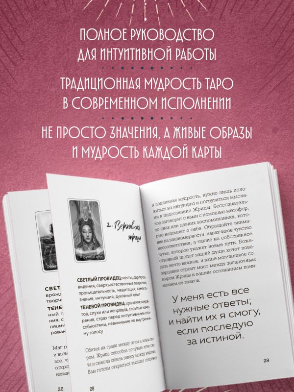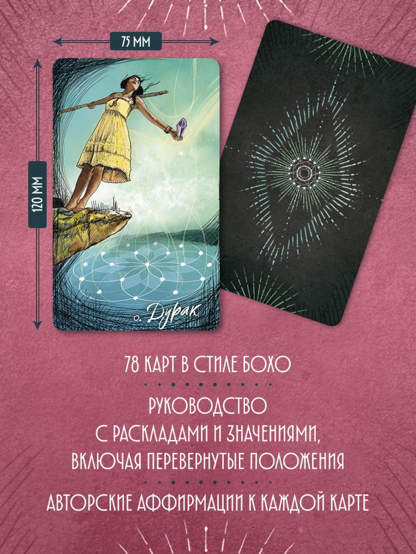 Компактное, но емкое руководство к колоде включает в себя правила работы с колодой, основные расклады, а также значения всех 78 карт в прямых и перевернутых положениях и авторские аффирмации к каждой карте.