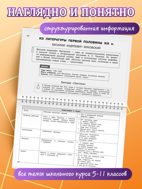 Школьный курс литературы за 5—11 классы собран в одной книге в удобной для запоминания форме. Информация представлена в наглядных схемах и таблицах, что позволит лучше понять и усвоить её. Кроме того, с помощью пособия можно быстро найти любую тему и систематизировать уже имеющиеся знания. Книга включает два раздела: теоретический и аналитический. В первом разделе даются сведения по теории литературы, сопровождаемые примерами, цитатами и пояснениями. Второй раздел содержит информацию о писателях и поэтах, а также комплексный анализ художественных произведений по развёрнутому плану. Пособие окажет существенную помощь в подготовке к ЕГЭ и ОГЭ, прочим формам контроля и урокам. Также оно может быть полезно учителям при планировании и проведении занятий.