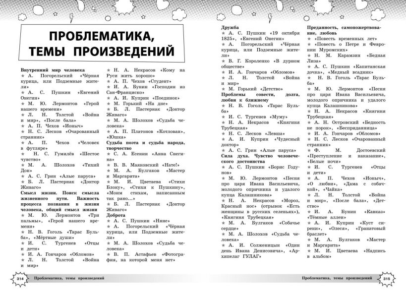 В книге представлены сведения по теории литературы, биографии писателей и разбор основных произведений школьной программы. Помимо этого, в конце пособия вы найдёте список с проблематикой и темами произведений.