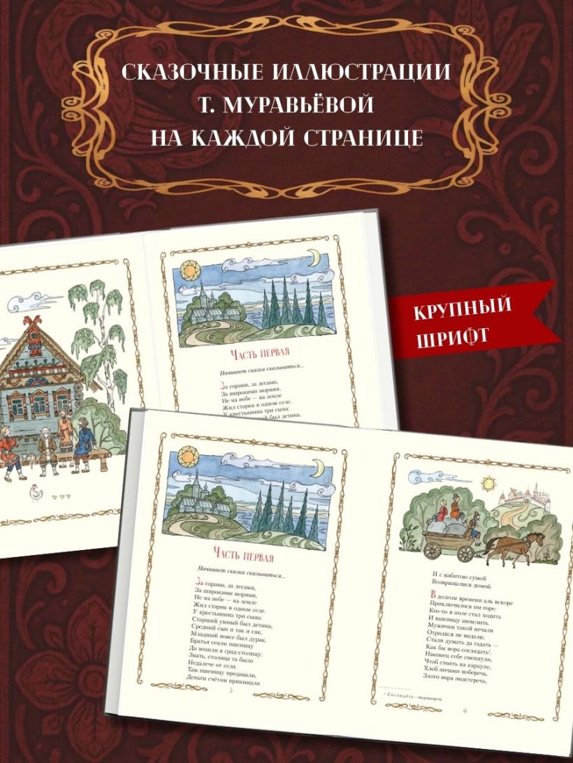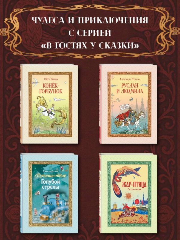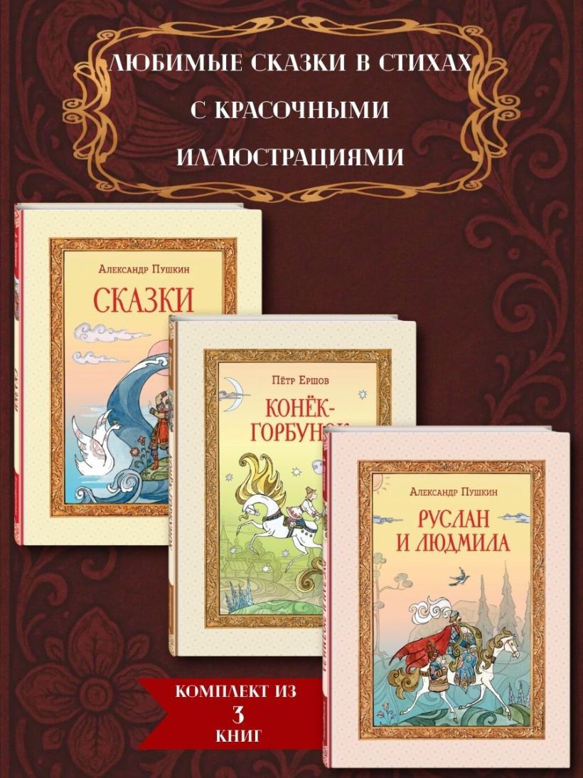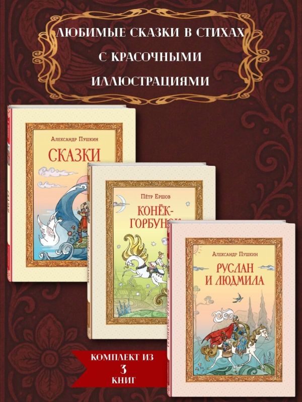 Комплект подарочных изданий состоит из трёх книг: А. С. Пушкин «Сказки», А. С. Пушкин «Руслан и Людмила», П. П. Ершов «Конёк-горбунок». Книги в твёрдом переплёте с частичным лаком. Плотная белая бумага. Чёткий, удобный для чтения шрифт. Яркие полноцветные иллюстрации.
