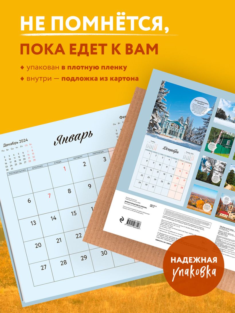 В этом настенном перекидном календаре на 2025 год представлены живописные места, в которых жили известные поэты и писатели. Повесьте этот календарь в своем доме или на рабочем месте, и он достойно украсит любой интерьер. А календарный блок напомнит о важных событиях года. В центре календаря помещен большой арт-постер, который может стать отдельным декоративным украшением интерьера.