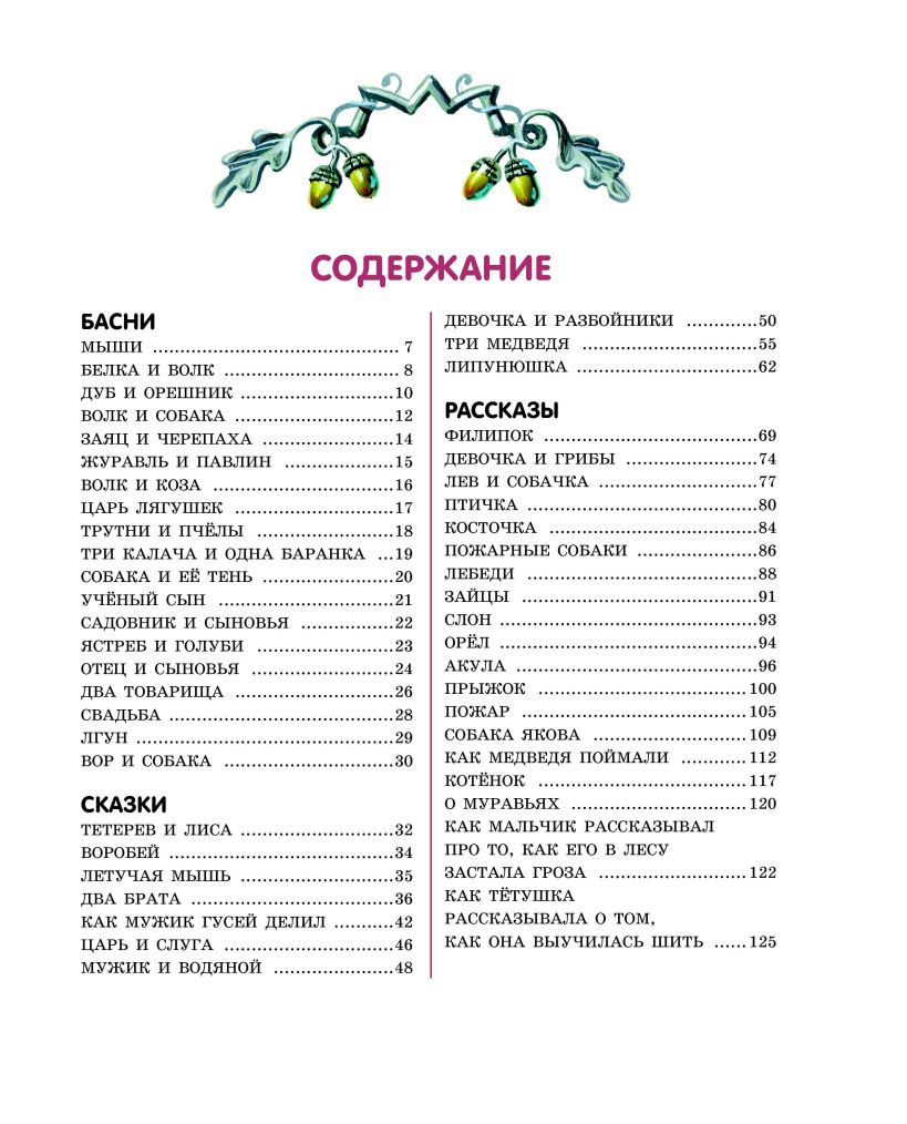 В сборник вошло 19 басен («Собака и её тень», «Отец и сыновья», «Два товарища» и другие), 10 сказок («Как мужик гусей делил», «Два брата», «Липунюшка» и другие) и 19 рассказов («Филипок», «Как медведя поймали», «Пожарные собаки» и другие).