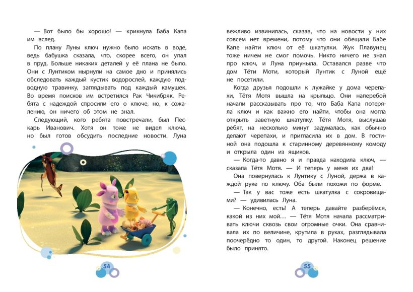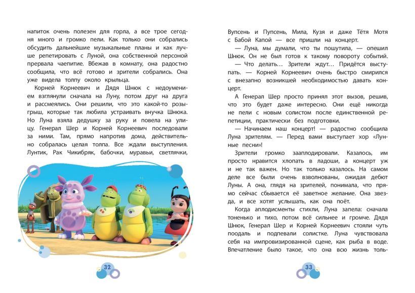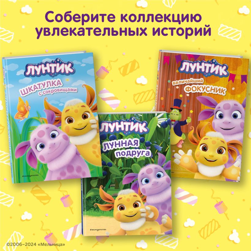 Сборник историй для малышей, таких же непоседливых и любознательных, как Луна и ее друзья! Очаровательную и непоседливую лунную гостью ждут новые приключения. В этих увлекательных рассказах она поможет Раку Чикибряку принять участие в конкурсе на звание лучшего кондитера, обнаружит в себе талант к пению, попытается достать до луны, чтобы её обнять, узнает, что же хранится в таинственной шкатулке с сокровищами, и сделает так, чтобы душа Дяди Шнюка запела вновь.