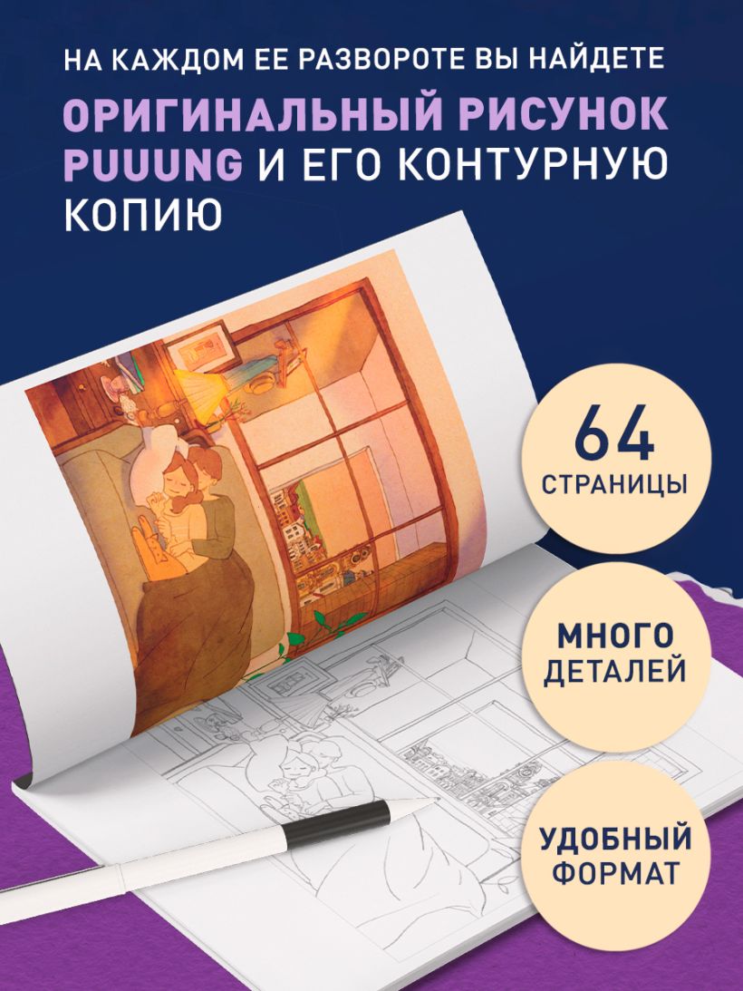 На каждом ее развороте вы найдете оригинальный рисунок Puuung и его контурную копию, сделанную художницей специально для вас. Раскрасьте ее по своему усмотрению: можете следовать за иллюстрацией художницы, а можете пофантазировать и создать свой уникальный рисунок! Блок раскраски сделан из плотной бумаги, что позволит использовать вам любые материалы: любимые краски, карандаши и даже фломастеры.