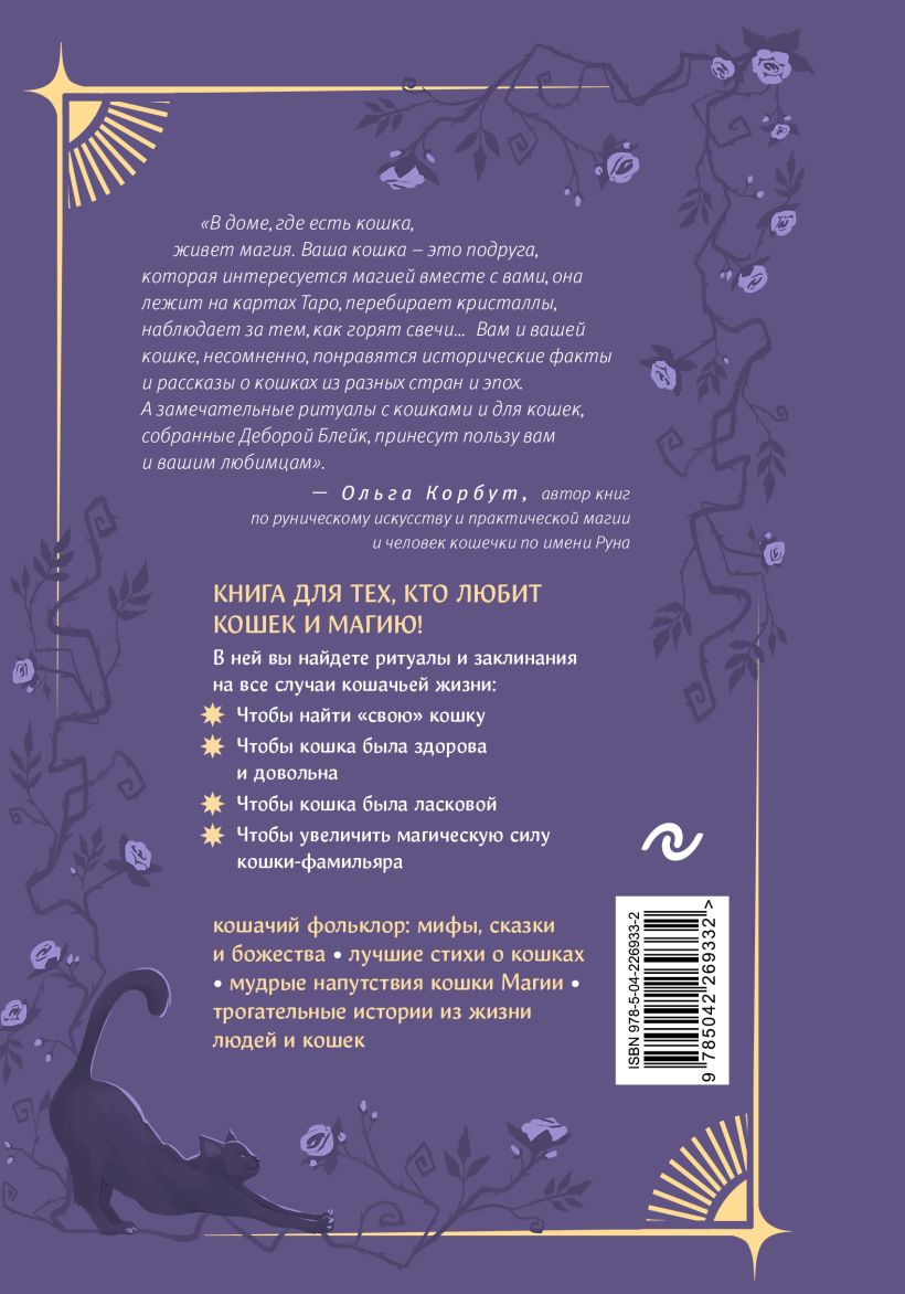 «В доме, где есть кошка, живет магия. Если вы интересуетесь магией, то для вас кошка не просто питомец с забавными ушками и мягкой шерстью. Ваша кошка — это подруга, которая интересуется магией вместе с вами, она лежит на картах Таро, перебирает кристаллы, наблюдает за тем, как горят свечи… Эта книга — о кошках, магии и о кошачьей магии. Вам и вашей кошке, несомненно, понравятся исторические факты и рассказы о кошках из разных стран и эпох. А замечательные ритуалы с кошками и для кошек, собранные Деборой Блейк, принесут пользу вам и вашим любимцам». — Ольга Корбут, автор книг руническуму искусству и практической магии и человек кошечки по имени Руна