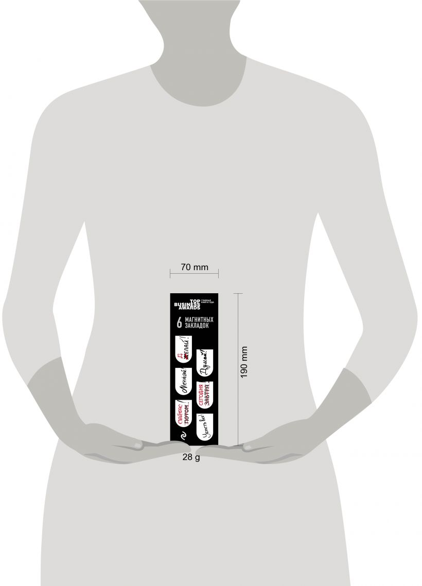 Шесть полукруглых магнитных зхакладок в стильном оформлении. Мотивирующие фразы «Делай!», «Твори!», «Сегодня», «Живи» — для тех, кто стремится быть, а не казаться. Новый удобный формат: используя их в качестве книжных закладок, вы будете всегда заряжены на новые свершения. Поехали!
