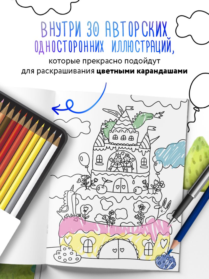В раскраске вы найдете 30 авторских односторонних иллюстраций, которые прекрасно подойдут для раскрашивания цветными карандашами.