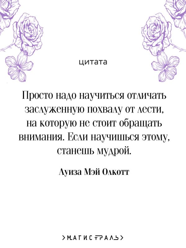 Олкотт писала о девушках и для девушек. На страницах этой книги юные красавицы увидят, как их ровесницы проживают актуальные для них проблемы, а молодые мамы снова окунутся в свое счастливое беззаботное детство, вспомнят свои веселые шалости, свою первую любовь.
