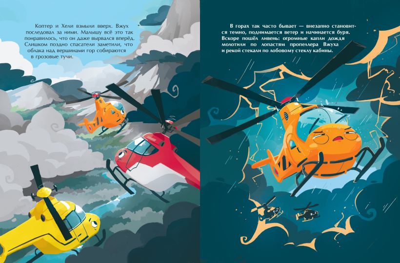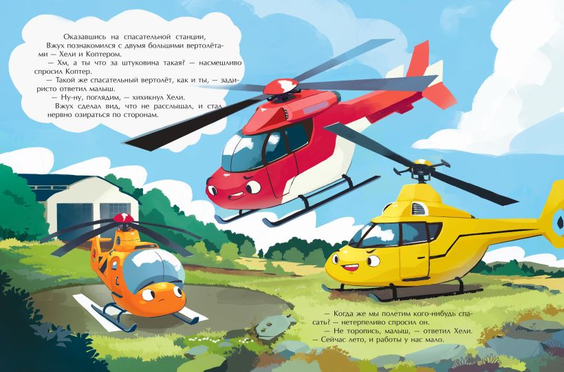 Спасение людей — дело трудное, но маленький спасательный вертолёт Вжух с нетерпением ждёт первой миссии, ведь он готов ко всему! Наконец наступает день, когда вертолётик поднимается в небо и… попадает в жуткую бурю! Теперь Вжух боится летать и выполнять свою работу.